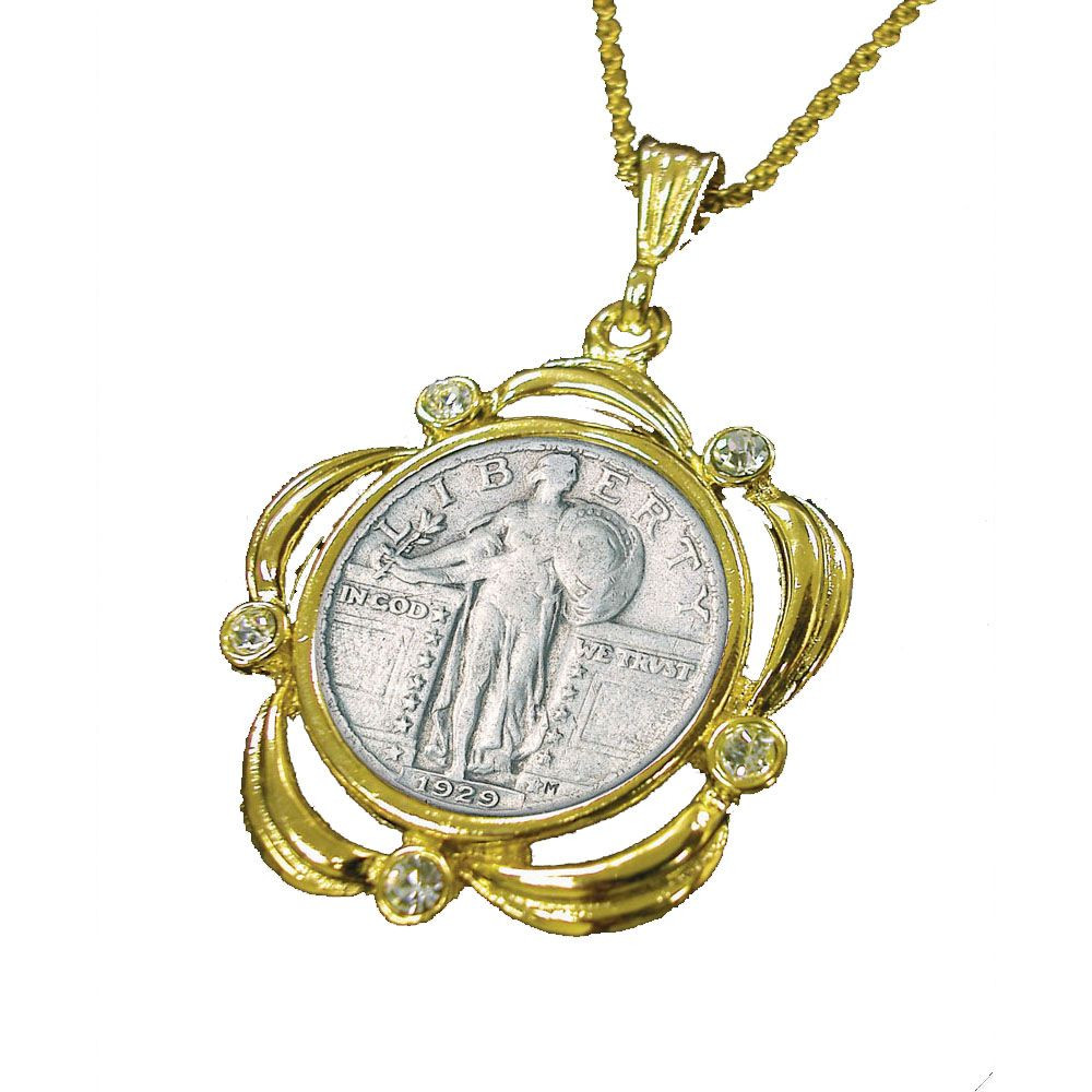- Collector's Silver Standing Liberty Quarter Goldtone Pendant Scalloped W/Crystals (24"Chain) - Actual Authentic Collectibles